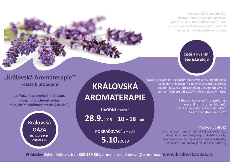 Královská Oáza zve na úvodní seminář s názvem KRÁLOVSKÁ AROMATERAPIE. Seminář proběhne v sobotu 28. září 2019 od 10.00 do 18.00 hodin v Královské Oáze, Obchodní 1572, Bystřice pod Hostýnem. Přihlášky: Sylvie Králová, tel.: 603 439 861, email: sylviekralova@seznam.cz. Příspěvek činí 1 650 Kč. Pokračovací seminář proběhne v sobotu 5. října 2019.
