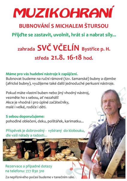 Královská Oáza zve na MUZIKOHRANÍ - bubnování s Michalem Štursou. Přijďte se zastavit, uvolnit, hrát si a nabrat síly do zahrady SVČ Včelín ve středu 21. srpna od 16.00 do 18.00 hodin. Hudební nástroje jsou i k zapůjčení. S sebou doporučujeme pohodlné oblečení, deku, polštářek, karimatku, Pokud máte vlastní buben nebo jiný vhodný nástroj, vezměte ho s sebou, ať nezahálí. Akce je vhodná i pro úplné začátečníky, malé i velké, rodiče i děti. Rezervace a případné dotazy na telefonu 777 830 310. Za nepříznivého počasí se akce bude konat v tanečním sále.