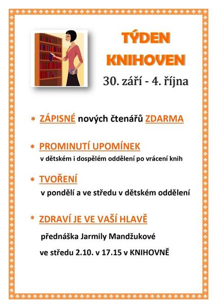 Městská knihovna Bystřice pod Hostýnem zve na TÝDEN KNIHOVEN, který proběhne od 30. září do 4. října 2019. V rámci tohoto týdne bude probíhat zápisné nových čtenářů zdarma, v pondělí a ve středu v dětském oddělení bude probíhat tvoření. Ve středu 2. října od 17.15 proběhne v knihovně přednáška Jarmily Mandžukové na téma Zdraví je ve vaší hlavě.