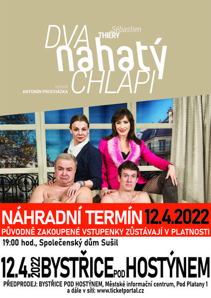 Z důvodu přetrvávajících omezení kvůli pandemii covid-19 a vyhlášenému nouzovému stavu se divadelní představení Dva nahatý chlapi z plánovaného termínu 27. 12. 2020 přesouvá na nový, náhradní termín - 12. 4. 2022. Původně zakoupené vstupenky zůstávají v platnosti.