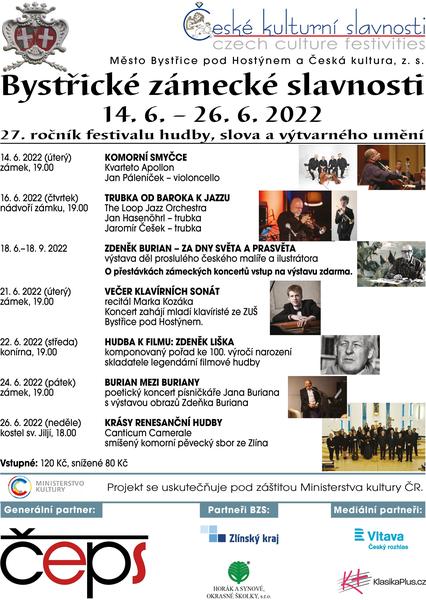 Město Bystřice pod Hostýnem a Česká kultura, z. s. pořádají ve dnech od 14. června do 26. června 2022 BYSTŘICKÉ ZÁMECKÉ SLAVNOSTI, 27. ročník festivalu hudby, slova a výtvarného umění. Vstupné 120 Kč, snížené 80 Kč.