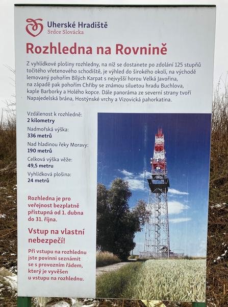 Železný, 49,5 metrů vysoký stožár sloužící zároveň jako vysílač byl postaven v roce 2003. Na vyhlídkovou plošinu ve výšce 336 m n. m. vede 125 schodů. Rozhledna poskytuje výhled do údolí nivy řeky Moravy a na masiv Chřibů na západě, Bílé Karpaty na východě, Napajedelskou bránu, Hostýnské vrchy a Vizovickou pahorkatinu na severu.