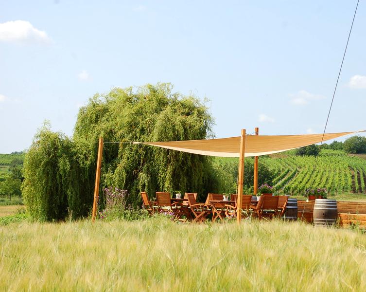 Skleničku delikátního vína si můžete vychutnat také na našem venkovním posezení a kochat se tak pohledem na vinici, ze které víno, které právě pijete, vzešlo.