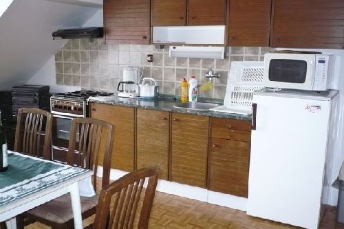 K dispozici kuchyň vybavená plyn. sporákem, mikrovlnnou troubou, kávovarem, a rychlovarnou konvicí.
