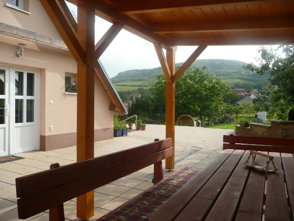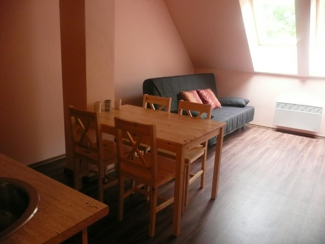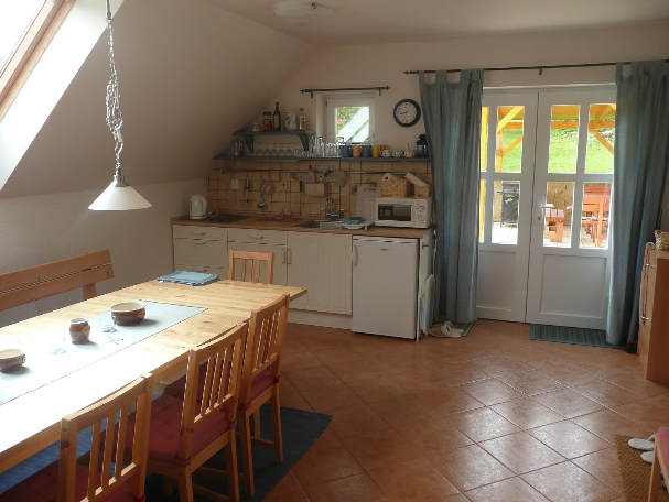 Odtud vede schodiště do mezonitového prostoru - ložnice se 4 lůžky. Kuchyňský kout je vybaven základním vybavením včetně lednice, mikrovlnné trouby, varné desky a rychlovarné konvice.