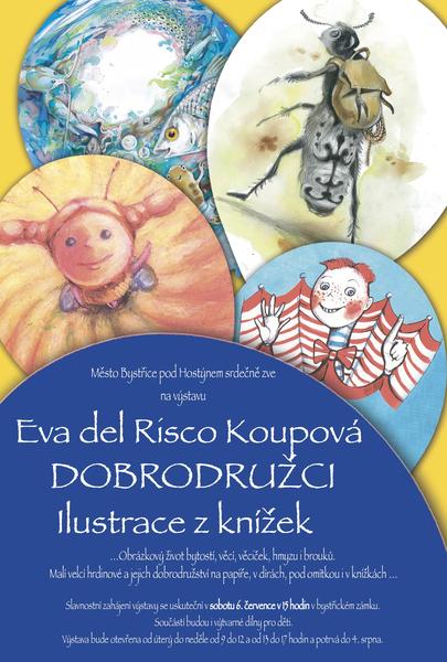Město Bystřice pod Hostýnem zve na výstavu Evy del Risco Koupové DOBRODRUŽCI ilustrace z knížek. Obrázkový život bytostí, věcí, věciček, hmyzu i brouků. Malí velcí hrdinové a jejich dobrodružství na papíře, v dírách, pod omítkou i v knížkách... Slavnostní zahájení výstavy se uskuteční v sobotu 6. července v 15.00 hodin v bystřickém zámku. Součástí budou i výtvarné dílny pro děti. Výstava otevřena od úterý do neděle od 9 do 12 a od 13 do 17 hodin a potrvá do neděle 4. srpna.