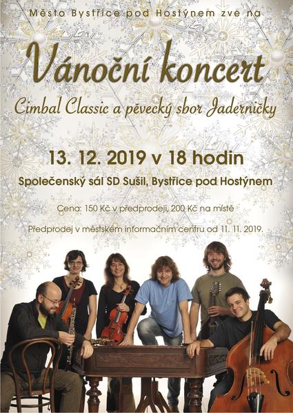 Město Bystřice pod Hostýnem zve na VÁNOČNÍ KONCERT CIMBAL CLASSIC A PĚVECKÝ SBOR JADERNIČKY. Koncert proběhne v pátek 13. prosince 2019 v 18.00 hodin ve Společenském sále SD Sušil, Bystřice pod Hostýnem. Cena v předprodeji 150 Kč, na místě 200 Kč. Předprodej v městském informačním centru od pondělí 11. listopadu.