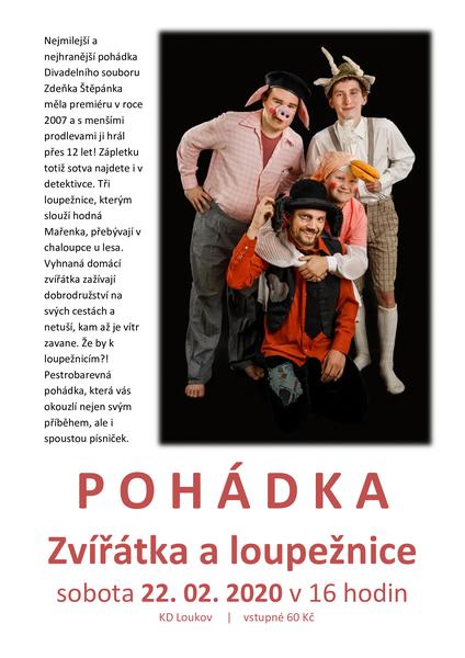 V sobotu 22. února 2020 se od 16.00 hodin v KD Loukov bude hrát pohádka ZVÍŘÁTKA A LOUPEŽNICE.