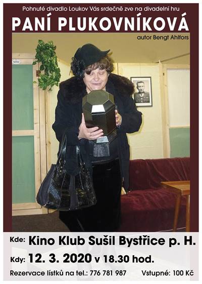 Představení se hraje ve čtvrtek 12. března 2020 v 18.30 hodin v Kino Klubu Sušil. Vstupné 100 Kč. rezervace lístků na čísle: 776 781 987.