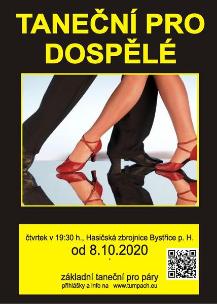 Hranická taneční škola pořádá TANEČNÍ PRO DOSPĚLÉ. Kurz je vhodný pro páry každého věku, výuka od základů. První hodina proběhne ve čtvrtek 8. října 2020 od 19:30 do 21:30 hodin v Hasičské zbrojnici v Bystřici pod Hostýnem. Počet lekcí: 5 + 1. Cena kurzu 850 Kč za osobu. Přihlášky a informace na www.tumpach.eu, e-mail: tumpachv@seznam.cz. Uzávěrka přihlášek do 4. října 2020.