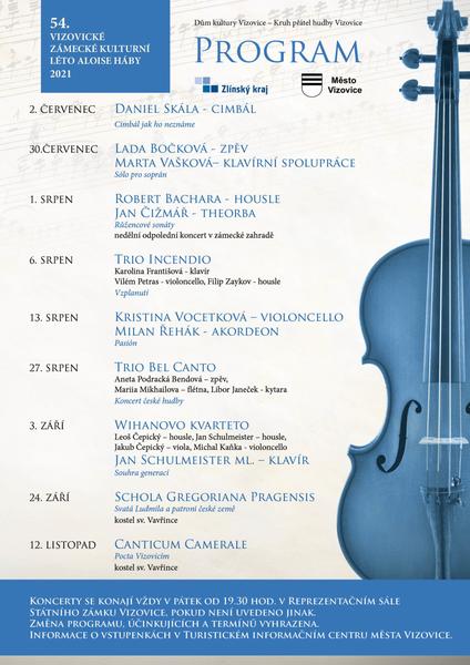 Koncerty 54. Vizovického zámeckého kulturního léta Aloise Háby 2021 se konají vždy v pátek v 19.30 v Reprezentačním sále Státního zámku Vizovice, pokud není uvedeno jinak. Informace o vstupenkách poskytne Turistické informační centrum.