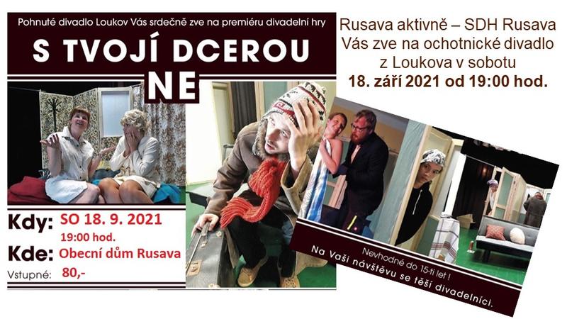 Rusava aktivně - SDH Rusava Vás zve na ochotnické divadlo z Loukova, které odehraje premiéru hry S tvojí dcerou NE. Akce se koná 18. 9. 2021 v 19:00 hodin v obecním domě na Rusavě.