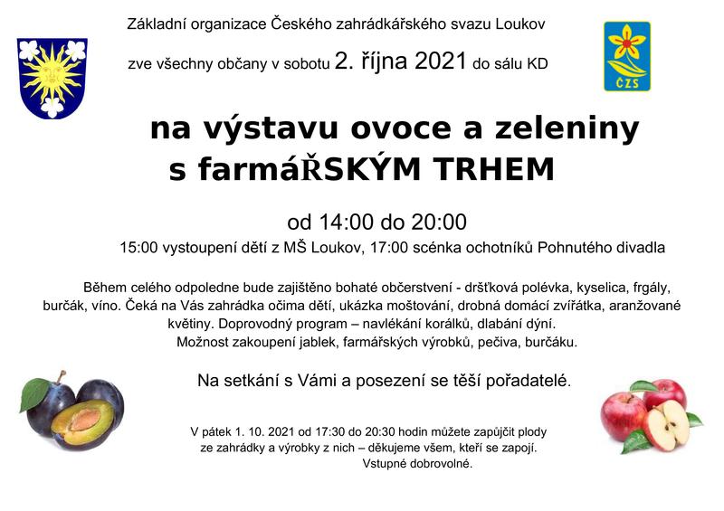 Základní organizace Českého zahrádkářského svazu Loukov zve všechny občany na Výstavu ovoce a zeleniny s farmářským trhem. Akce se koná 2.10.2021 ve 14:00 hodin v sálu KD Loukov.