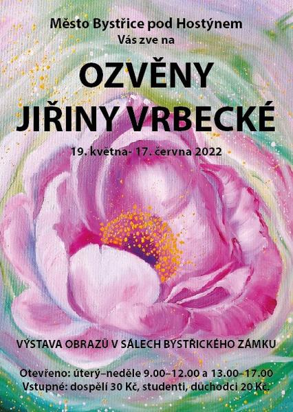 Město Bystřice pod Hostýnem vás zve na výstavu OZVĚNY JIŘINY VRBECKÉ, která proběhne ve dnech od 19. května do 17. června 2022 v sálech bystřického zámku. Otevřeno úterý až neděle, 9:00–12:00 a 13:00–17:00 hodin. Vstupné: dospělí 30 Kč, studenti, důchodci 20 Kč.