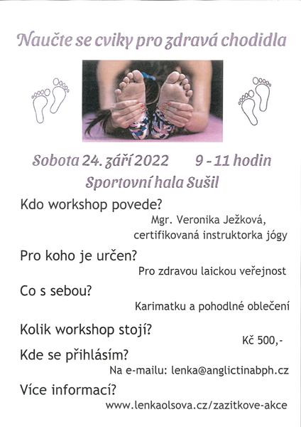 Workshop "Naučte se cviky pro zdravá chodidla" se uskuteční v sobotu 24. září 2022 od 9:00 do 11:00 hodin ve Sportovní hale Sušil. Workshop povede certifikovaná instruktorka jógy Mgr. Veronika Ježková a je určen pro zdravou laickou veřejnost. S sebou karimatku a pohodlné oblečení.