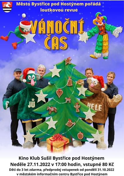 Město Bystřice pod Hostýnem pořádá loutkovou revue VÁNOČNÍ ČAS. Uskuteční se v neděli 27. listopadu 2022 v 17 hodin v Kině Klub Sušil.
