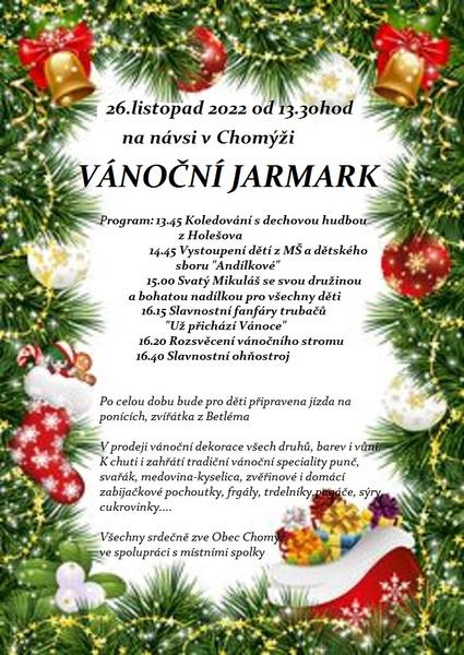 Obec Chomýž ve spolupráci s místními spolky srdečně zve na VÁNOČNÍ JARMARK na návsi v Chomýži v sobotu 26. listopadu 2022 od 13:30 hodin.