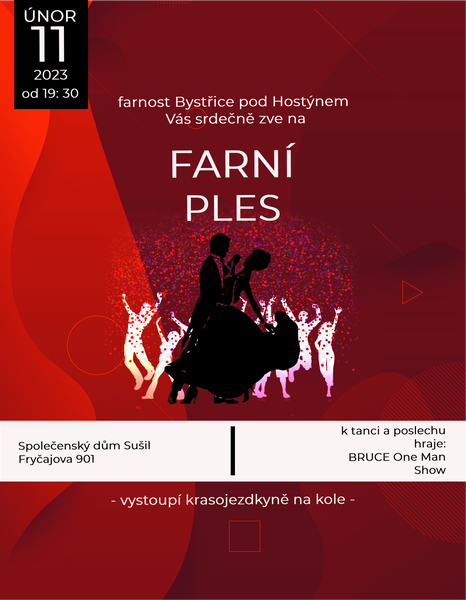 Farnost Bystřice pod Hostýnem zve na FARNÍ PLES, který se uskuteční v soboru 11. února 2023 od 19:30 hodin ve Společenském domě Sušil.