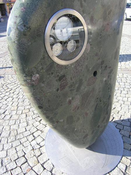 Kamenná plastika na Dolním náměstí - PLANETKA - meteorologický sloup.sochařsky pojatý objekt planetky, jejíž skutečná předloha krouží ve vesmíru pod číslem 27079.