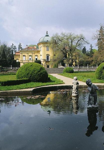 Zámek obklopuje zámecká zahrada s parkem, které představují jedny z našich nejvýznamnějších památek tzv. historické zeleně, tvořící neoddělitelnou součást reprezentační architektury šlechtického sídla. Zahrada byla zakládána současně s výstavbou zámku od počátku 18. století. Svažující se terén od západu k východu si vynutil její terasovité uspořádání. Nejvýše položenou terasu zaujímalo zámecké nádvoří s kašnou ve tvaru kvadribolu a s obeliskem uprostřed. Do kompozice zahrady byl začleněn také potok. Zikmund Karel Petřvaldský dal zhotovit dekorativní tepané mříže mezi pilíři s putty a vázami, spojující rizality hlavní budovy a oddělující nádvoří od parku. S nástupem Berchtoldů došlo postupně k podstatnému rozšíření zeleného areálu zámku - vznikal přírodně krajinářský park anglického typu, jehož nepravidelnou a živou kompozici tvořily travnaté plochy se skupinami jehličnatých a listnatých stromů. Zasloužili se také o výsadbu exotických a vzácných dřevin. Park oživuje množství soch. V parku byly založeny sortimentální sbírky rododendronů a obnoveny sbírky kbelíkových dekoračních rostlin. Od roku 1981 je zde každoročně prezentována sbírka světového sortimentu fuchsií ze zámeckého zahradnictví.
