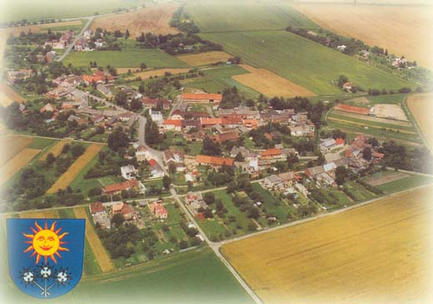 Znak - v modrém štítě zlaté slunce s tváří, pod ním tři překřížené střibrné řemdichy