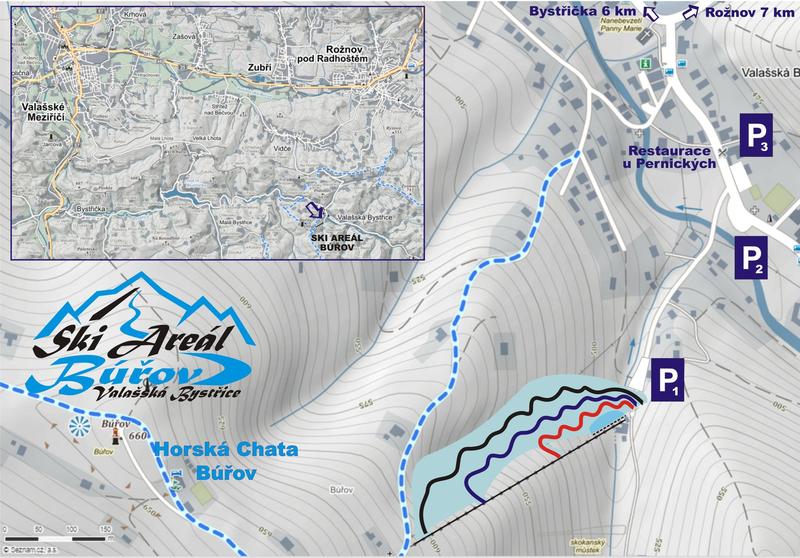 SKI AREÁL BÚŘOV se nachází v malebném prostředí Beskyd v obci Valašská Bystřice, která je vzdálená 7 km od Rožnova pod Radhoštěm.
