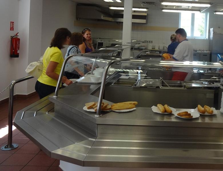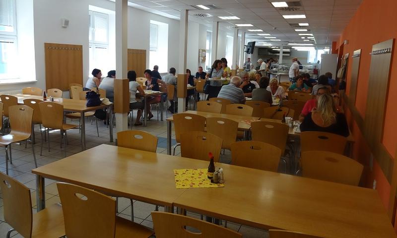 Klimatizovaná samoobslužná jídelna v budově Ubytovacího a stravovacího centra v Uherském Hradišti. Výběr z 10 druhů jídel.