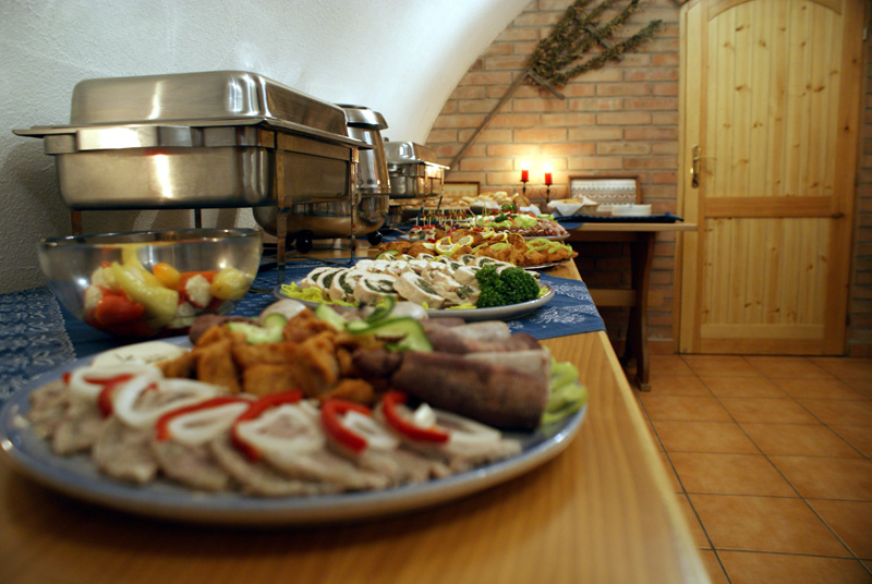 Naší specialitou jsou domácí pomazánky k vínu, čerstvě pečené slané pečivo a tradiční domácí koláče. Po celý večer je hostům k dispozici čerstvá voda v džbánech zdarma, stejně jako káva a čaj. Dvě pohoštění jsou založeny na specialitách studené kuchyně a další dvě pohoštění zahrnují i teplou večeři, "poctivý" guláš, který je tím nejlepším "základem" pro posezení ve sklípku s vínem.