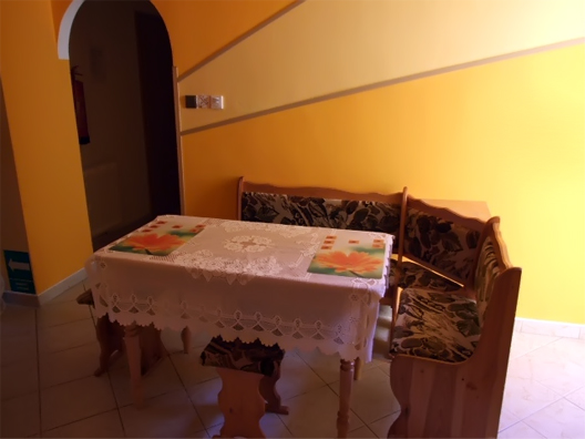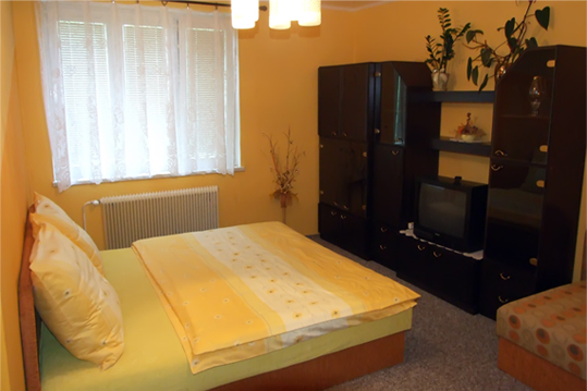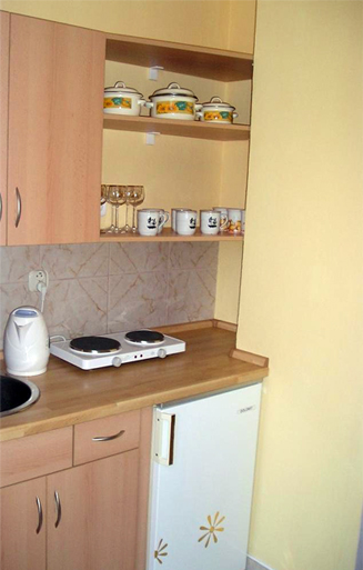 Ve společné části se nachází jídelní stůl a vybavený kuchyňský kout s menší ledničkou, vařičem a rychlovarnou konvicí (veškeré nádobí k dispozici). Dále je možnost 1 samostatné přistýlky v menším pokoji – bez TV a sociálního zařízení (nutno využívat sociální zařízení na pokoji, ke kterému bude tento samostatný pokoj objednán).