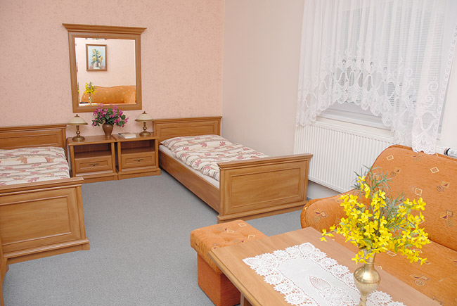 Pokoje jsou vybaveny stylovým a vkusným nábytkem. Lůžka na pokojích jsou vybaveny latexovými matracemi a anti-alergenními lůžkovinami firmy Klinmam pro Váš kvalitní spánek. Součástí každého pokoj je samozřejmě koupelna se sprchovým koutem a WC, v apartmánech se pak nachází masážní vany od společnosti Ravak. Na pokojích naleznete také pevné připojení na internet. Celý areál je pokryt signálem bezdrátového připojení k internetu (Wi-Fi).