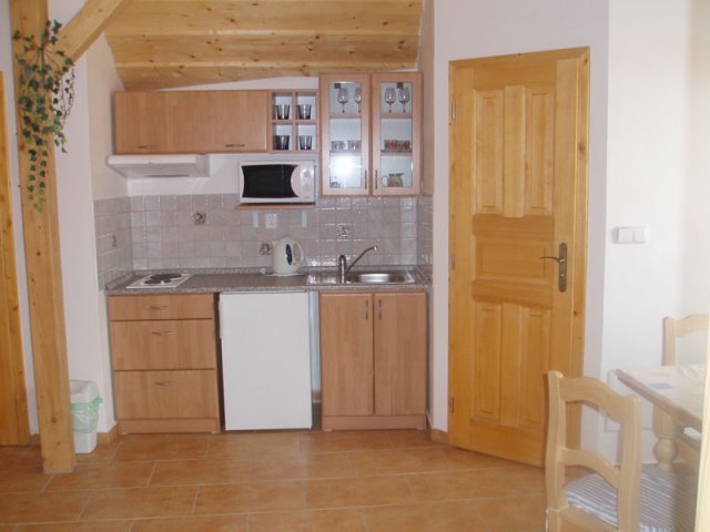 Plně vybavenou kuchyni – lednička + mraznička, elektrický vařič, rychlovarná konvice,mikrovlnná trouba, TV s ovládáním, sociální zařízení – sprchový kout + WC s umyvadlem.