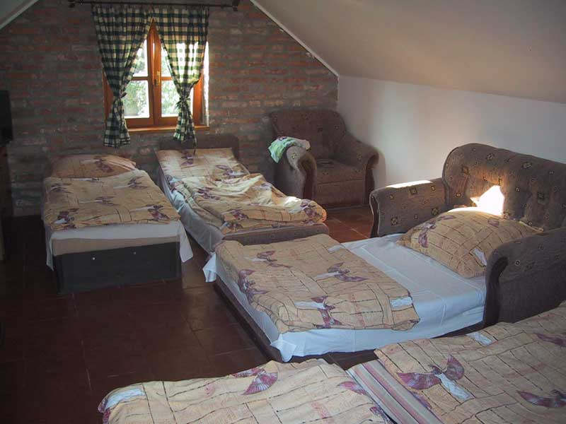 Přímo nad sklepem se nachází ubytování pro 14 osob, pokoje jsou vybaveny novým nábytkem, pokoje jsou rozděleny 2 x 4, 1 x 6 s kuchyňkou cena 300 kč os. Na dvoře se nachází venkovní posezení s grilem.