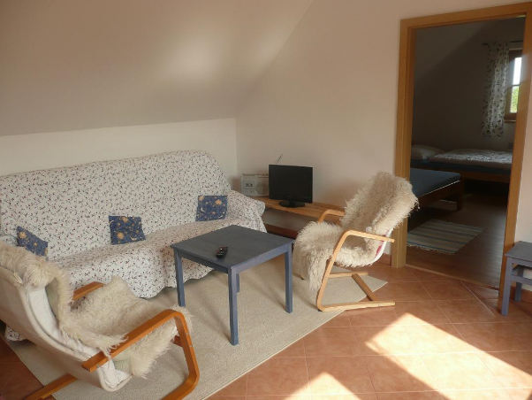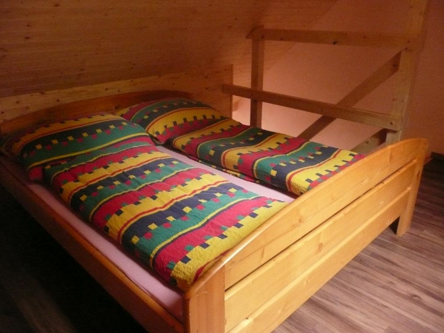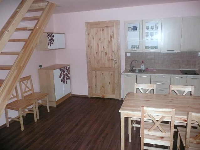 Odtud vede schodiště do mezonitového prostoru - ložnice se 4 lůžky. Kuchyňský kout je vybaven základním vybavením včetně lednice, mikrovlnné trouby, varné desky a rychlovarné konvice.