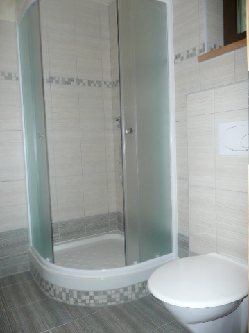 Ze zádveří je vstup do koupelny (WC, umyvadlo a sprchový kout) a do obývacího pokoje s kuchyňským a jídelním koutem, rozkládací pohovkou (sloužící jako dvoulůžková přistýlka) a TV.